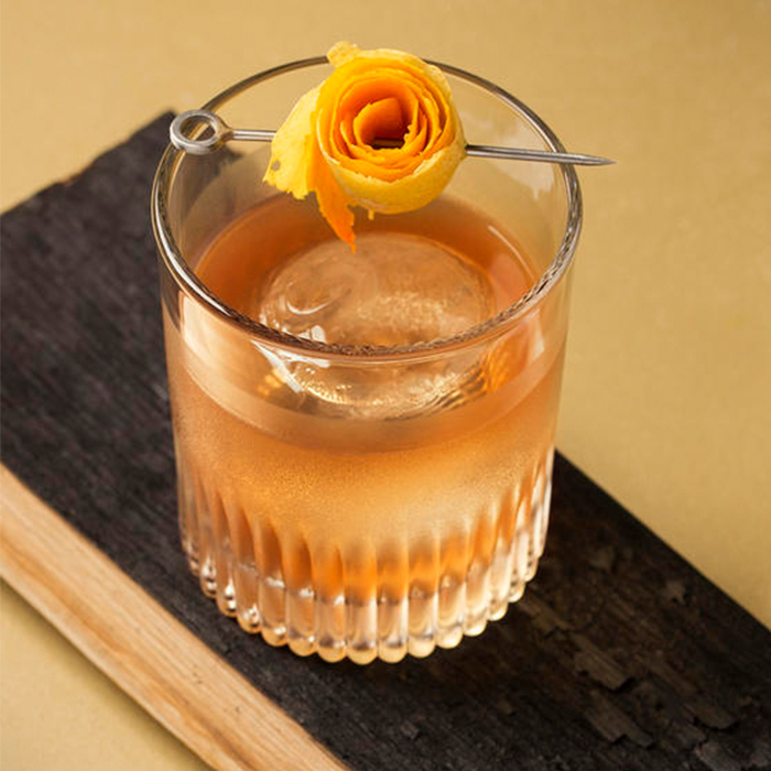 Garnitur: Drücken Sie sowohl eine Orangen- als auch eine Zitronenschale über dem Cocktail aus, um deren ätherische Öle freizusetzen, und garnieren Sie das Getränk mit denselben Schalen.